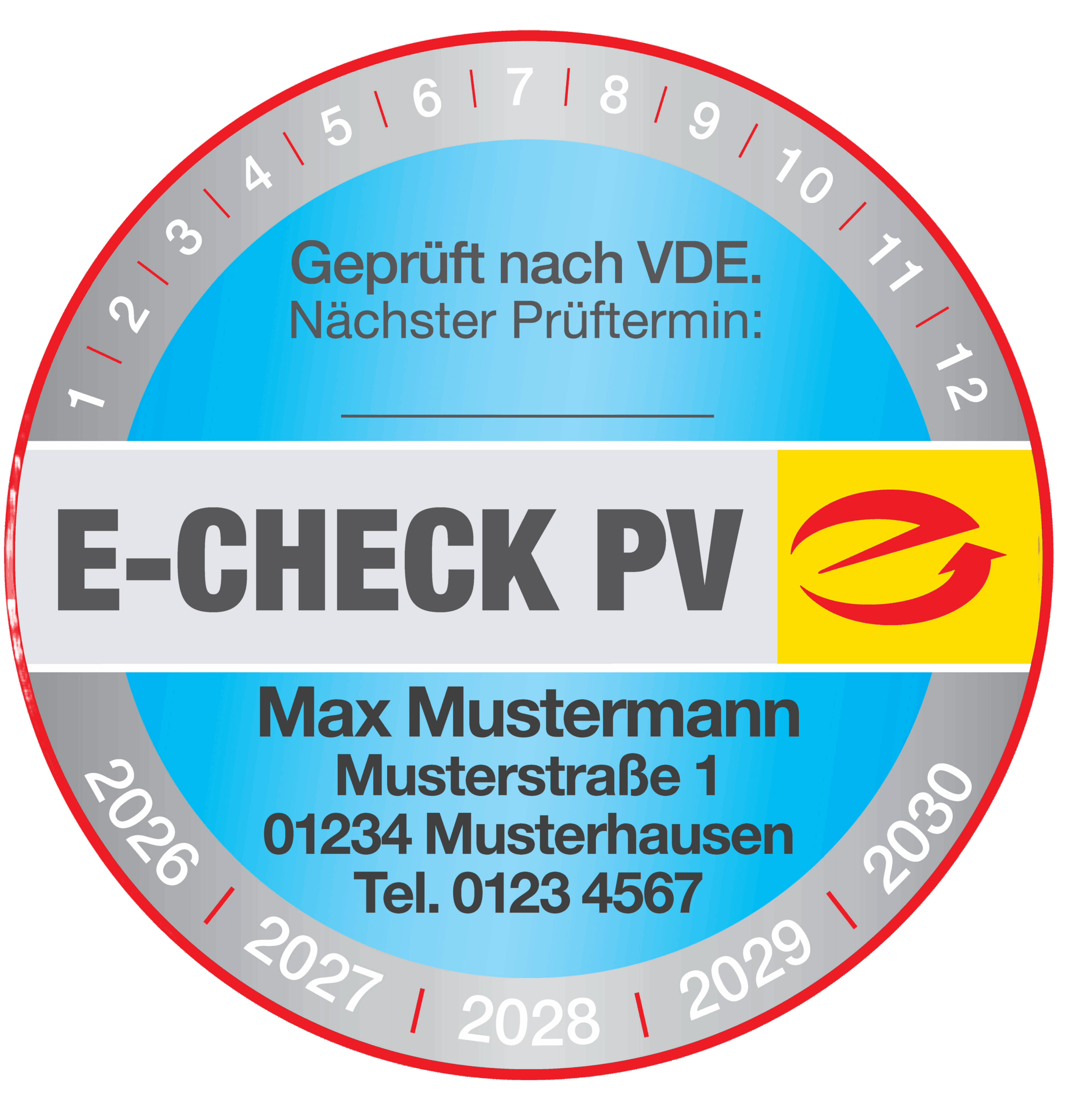 Sicherheits-Prüfplakette E-CHECK für Photovoltaik Anlagen. Mit Ihrem Firmeneindruck!